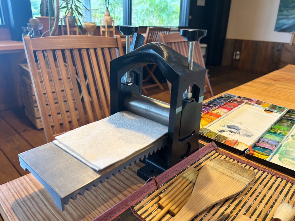 (画像①)このプレス機は、私が⼤学の版画研究室を修了したときに、教授が3Dプリントで作ってくれたものなんです。普段は作品のサイズも大きいので、大きいプレス機の方が使い勝手がよく、なかなか使う機会はなかったのですが、今回滞在制作で、持ち運びながら版画を刷るのにちょうど良いなと思い、持ってきて使っています。