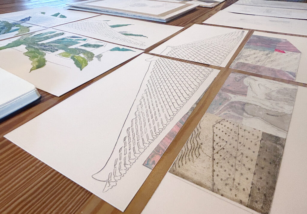 ここに来るとき、⼀番迷ったのが画材でした。普段使っているものは、移動に向かない素材ばかりなんですよね。私には定まった素材がなくて、鋳造、⽇本画、版画、いろんな表現⽅法があります。その道具を全部持っていくのか、⼀つに絞るのか、もしくは鉛筆とiPadだけで軽装備にするのか…どういうセッティングで⾏くのがいいか悩みました。でも、事前に「こういう作品を作ろう」とは決めたくなかったので、⼀つずつのボリュームは抑えつつ、版画と日本画の最低限の装備をできる限り持ってきて作り始めました。