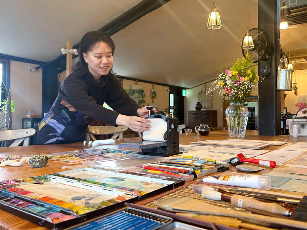 ⾃分の制作は、今まで場所に縛られていたなと思いました。⽇本画や版画など、移動しづらい素材や技術を結構使っているんですけど、今回、それをどうにかして旅先でもできないかなと試⾏錯誤して、実験的なことに挑戦できたんです。それは、この先の⾃分の制作にもきっと糧になると思います。