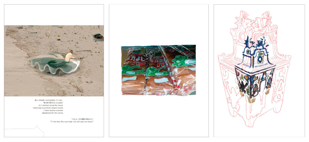 はい。沖縄で散歩して見つけたものから空想してiPadで描いた作品を、まとめてZINEにしようと思って作っています。ストーリーがあるわけではないんですけど、言葉と絵が組み合わさって1ページになっているものが20ページくらいになる予定です。文章は、絵のタイトルにリンクするような形で書いています。先に言葉を決めて、あとからその言葉のイメージで絵を描くこともあります。