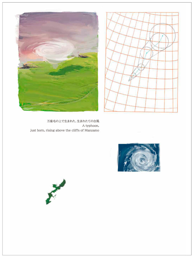 (画像⑥)滞在中の時期には台風はあんまりないんですけど、台風の絵を描こうって思って。車で西側の海岸線をずっと南まで旅行していて、その途中で通った万座毛という有名な観光地に草原があって、その先に切り立った崖があり、そこから受けた印象で描きました。本当は北半球の台風は反対周りになるのですが、逆向きに描いてみました。