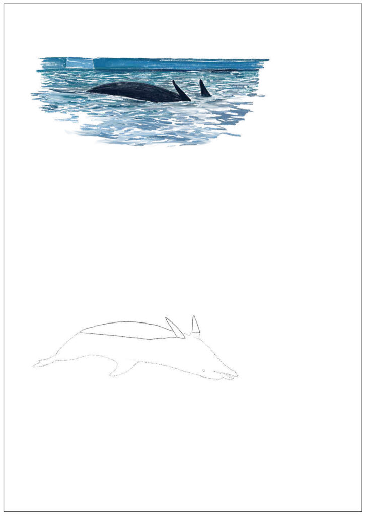 (画像⑦)美ら海⽔族館の近くを散歩していたときに、イルカショーをやってて、それを⾒て描きました。チケットを買わなくても外側から⾒えるんですよね。こういうトゥルンしたお腹を実際に⾒たんですけど、そこから想像して⽔の中の様⼦を描きました。