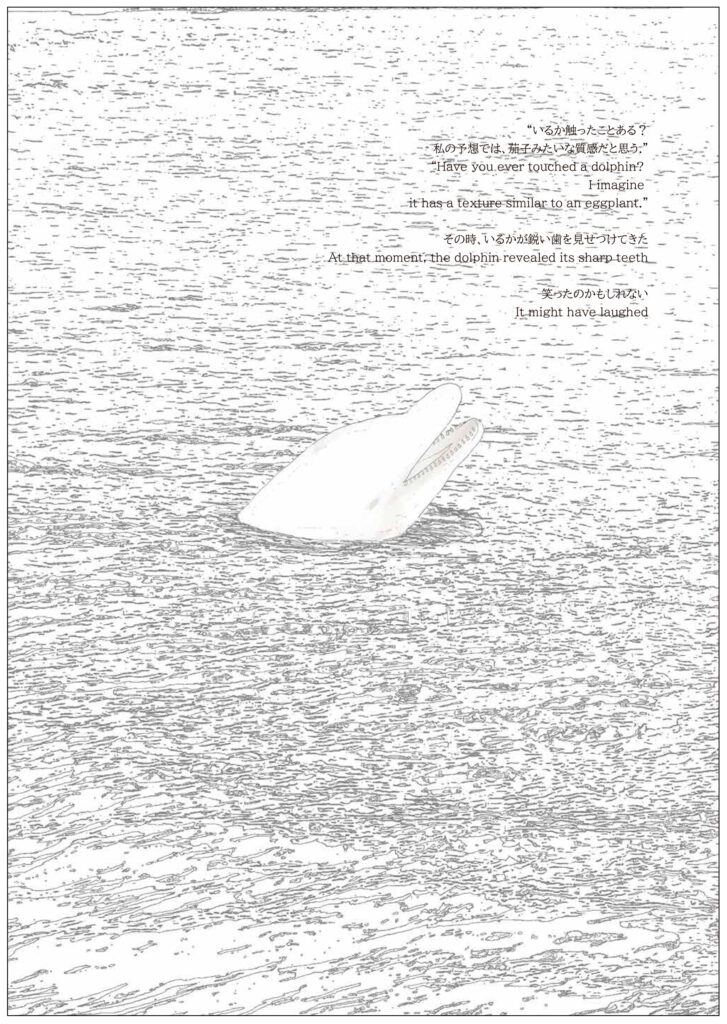 (画像⑧)これも沖ちゃん劇場のイルカショーを見た印象と、別の日に、近くの港を歩いていたときの体験を元に描きました。イルカの飼育場が近くにあって、夜に歩いていると何も見えないのにイルカの息継ぎの音がすごく聞こえるんですよ。人の声みたいな「フンーフンー」っていう音で、不思議な印象で。「可愛いイルカ」じゃなくて、少し奇妙な感じに描きたいなと思いました。