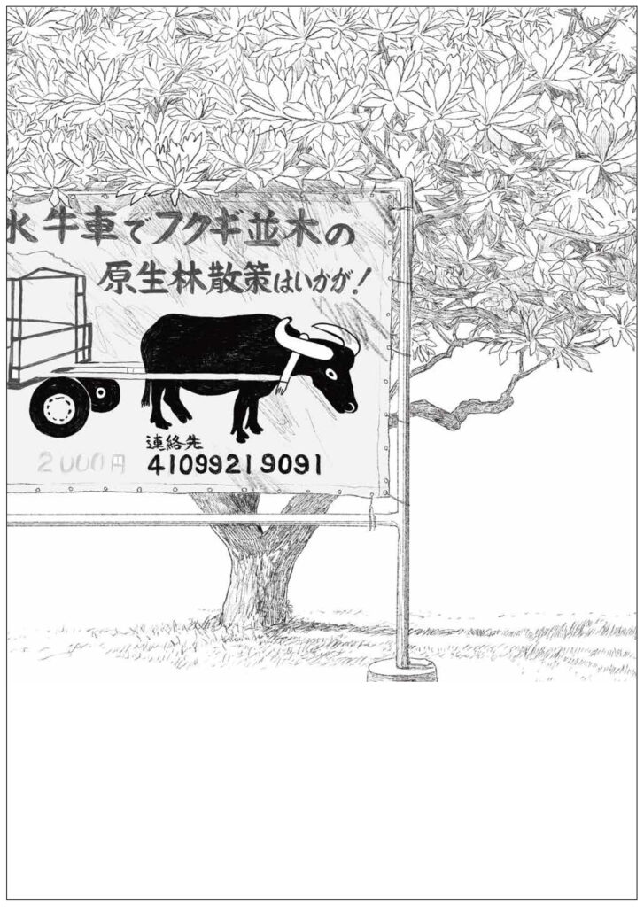 (画像⑨)これも実際にこういう場所はなくて、木は想像で描いたんですけど、この看板はほぼ見た通りに描いています。この看板が好きすぎて描いたんです。水牛の顔も、引っ張っている感じも良いし、形のいびつさとかも全部天才的に良いな、超良い絵だなって思って(笑)。こういう絵って描こうと思っても描けないんですよね。看板に書いてある言葉も良いんですよ。