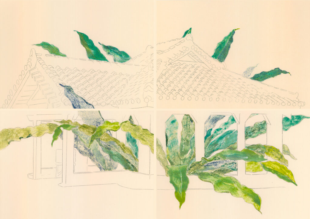 この辺は観光地の中心ではなくて民家も多く、細い道に入っていくと人が住んでいない古い民家があったりするんですよね。家を飲み込もうとしている密度のある自然と、人が住まなくなった家の中の空洞…その「疎」と「密」の対比がすごくビビットに思えたりして、そういう感覚に反応しながら描いているかなとは思います。