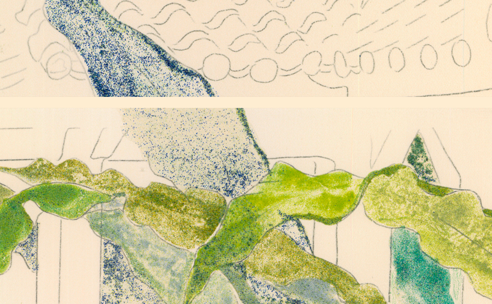 この作品は銅版画に使うプレス機で刷った凹版の作品なのですが、今回は銅板の代わりにプラスチックの板をニードルで彫りました。普段は腐食液という薬品で線を溶かして彫るのですが、滞在中は薬品の廃棄が難しいので、旅行仕様にしました。