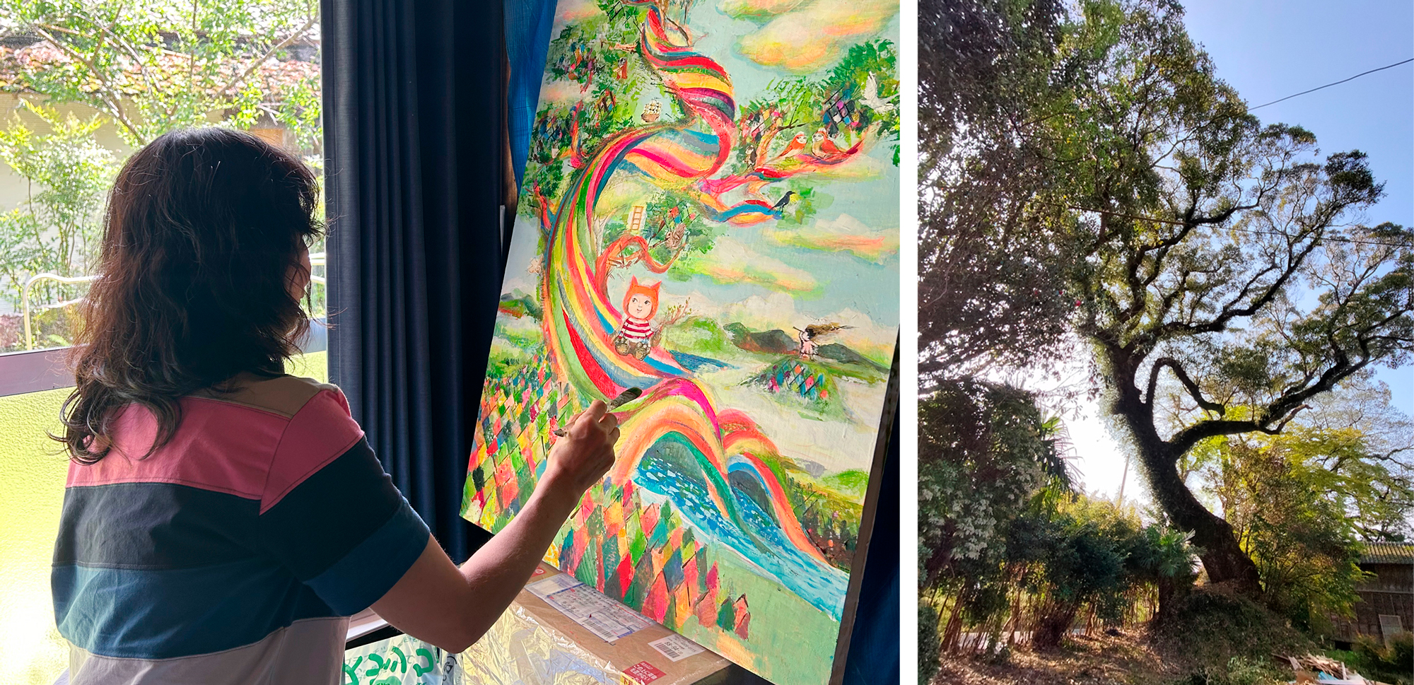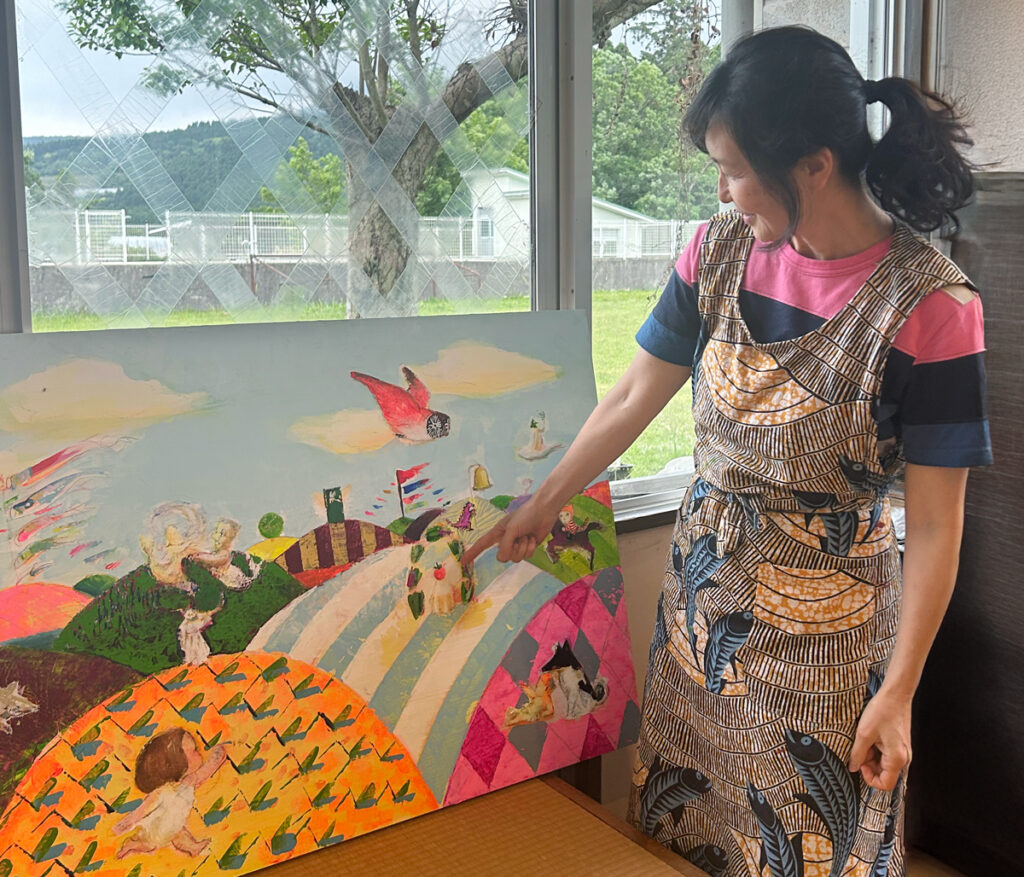 とにかく元気をいただきました。私にとって絵を描くことは好きなことなので、これまでも苦痛に感じたことは⼀度もなかったんですけど、今回の滞在制作はなんとも⾔えない開放感で、⼿探りしながら描くような感じが⼀切なかったんです。エネルギーをもらって、それをそのまま⼦どもになったような気持ちで素直に描いてみてもいいんだ、と思えました。それが⼀番⼤きなことですね。ここ、えびのの⾃然の中でゆっくり過ごせたことや、⽇常⽣活から切り離された環境の影響もあったと思います。絵にも「⼒」や「元気」が宿ったんじゃないかな、と思っています。願いも込めてですけど。⾒てくださった⽅から「元気が出ます」と⾔っていただけて、本当に嬉しかったですね。