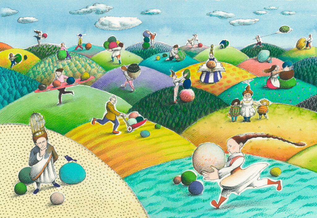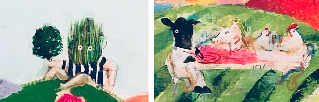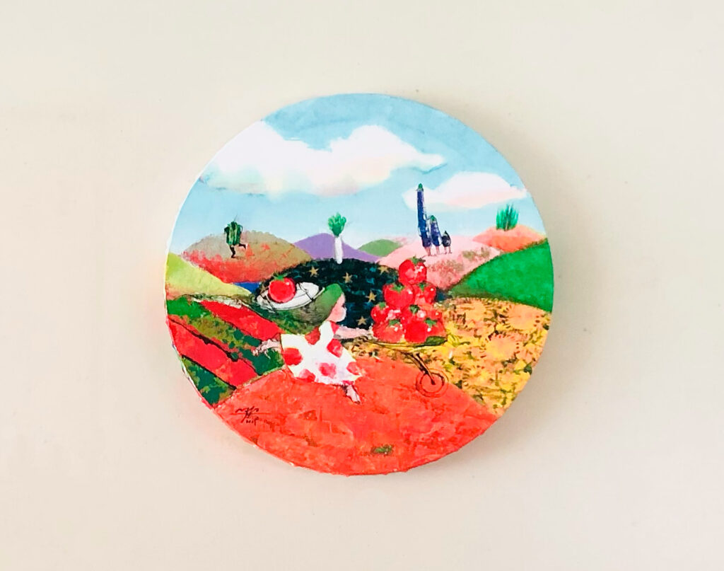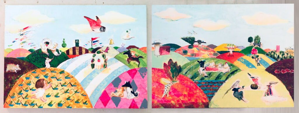 私が宮崎にきて最初に感じたのが「⼭がポコポコまあるい」という印象だったんです。「なんてかわいい形の⼭なんだ!」と思い、絵にしました。以前アグリテルさんのHPに使っていただいた作品も、ポコポコした⼭と、その⼀⼭⼀⼭を⾃分の⼭として管理している個性豊かな⼈たちを描いたものだったんです。その⼈たちは⼭を⽀配するのではなく、それぞれの豊かな⾊合いの⼟地を⼤事にしながら楽しく暮らしていて。今回もその様⼦を表現できればと思いました。