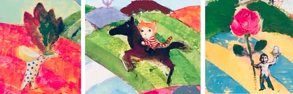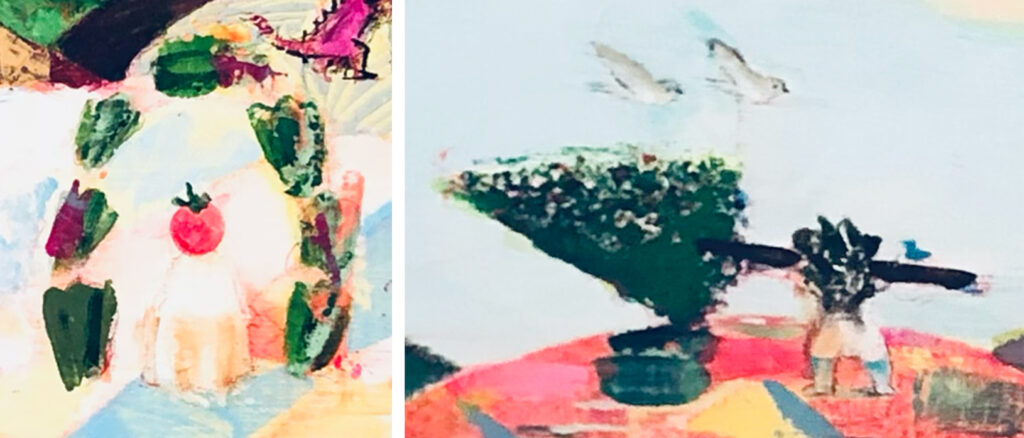 (画像④)は、宮崎に来たとき最初に⾒た、緑の中をひらひらと泳ぐ鯉のぼりがすごく綺麗で、その印象を描きたいなぁと思い絵にしました。(画像⑤)はタンポポなんですけど、綿⽑に⾍たちが⾶んできているのが可愛いくて、⼦どもが⾍の気持ちになって綿⽑を持っている様⼦を描きました。