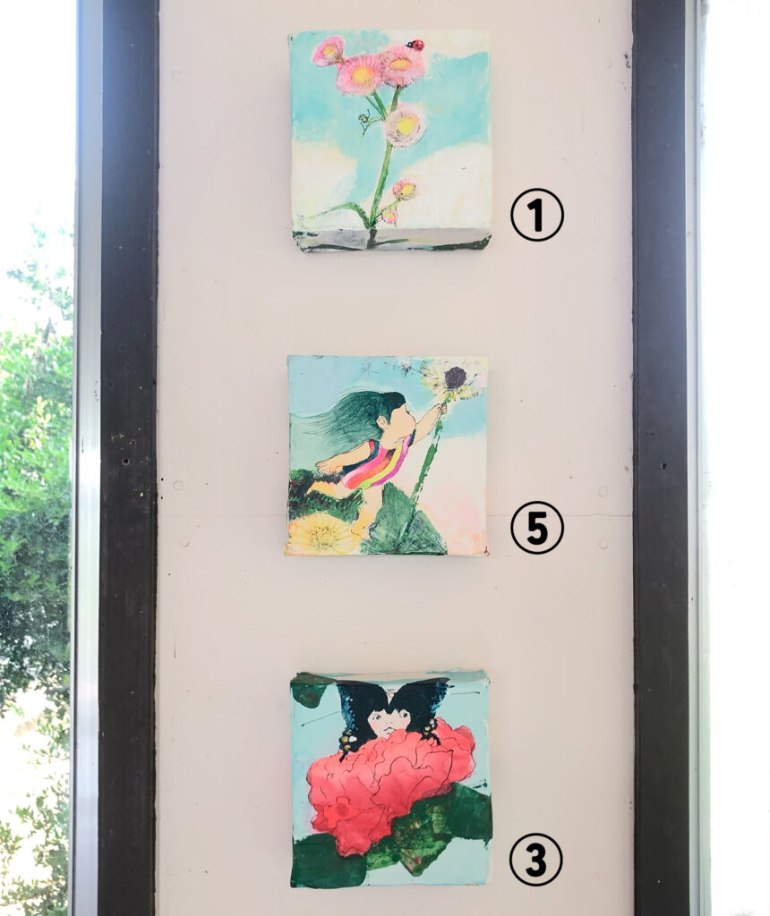 (画像①)にはハルジオンを、(画像②)にはクローバーを描きました。(画像③)は松形邸の庭に咲くサザンカやツツジに⿊いチョウが⾶んできて、その⾚⾊と⿊⾊のコントラストが綺麗だな、と思い作品に表現しました。